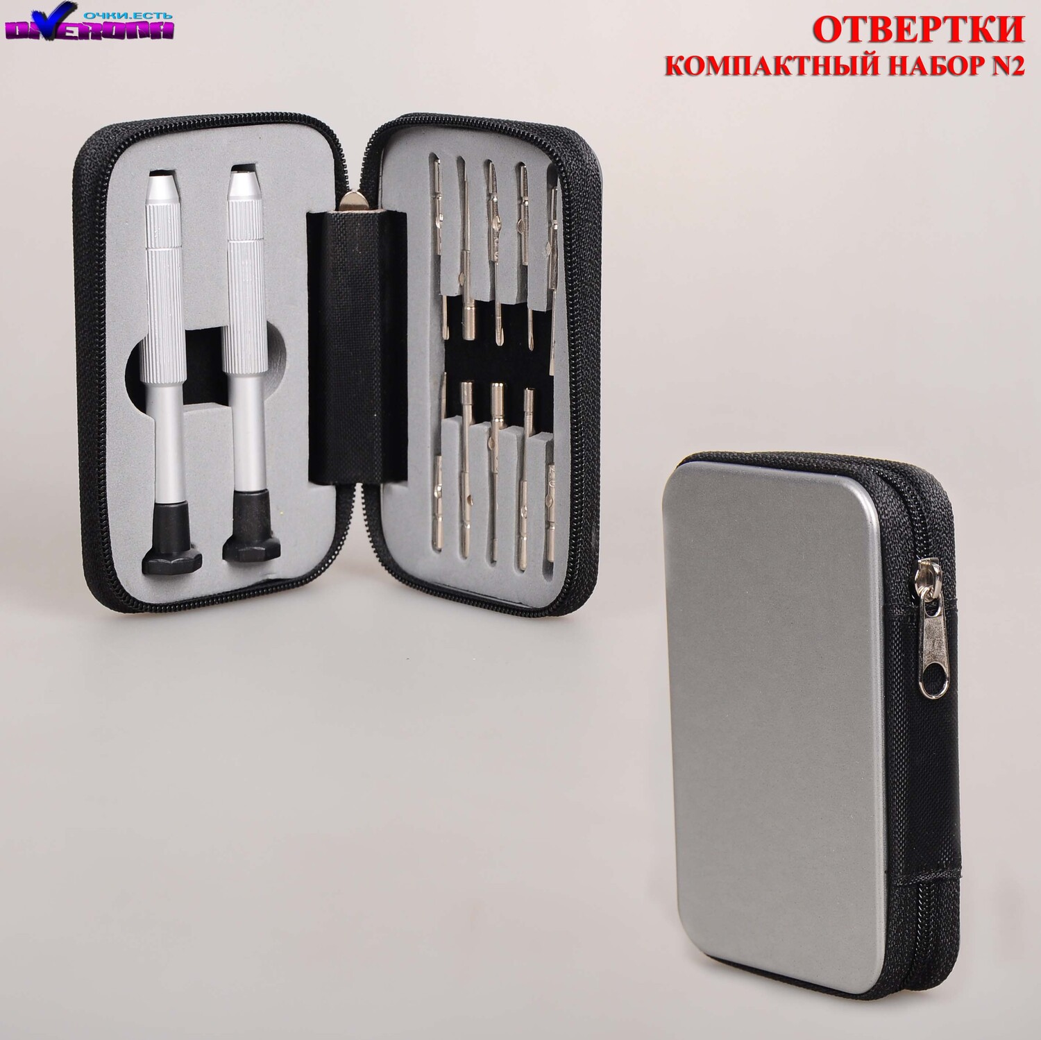 A set of mini-screwdrivers in a metal case with two holders and 10 nozzles for repairing glasses No. 2 to the optician to the