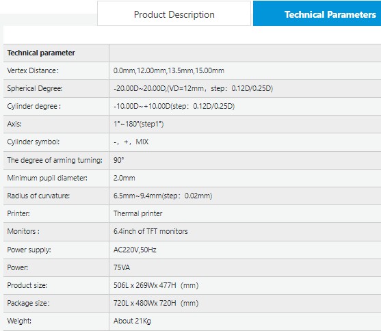 - Сфера: -20.00D ~ 20.00D, (VD = 12 мм, шаг: 0.12 / 0.25 D)