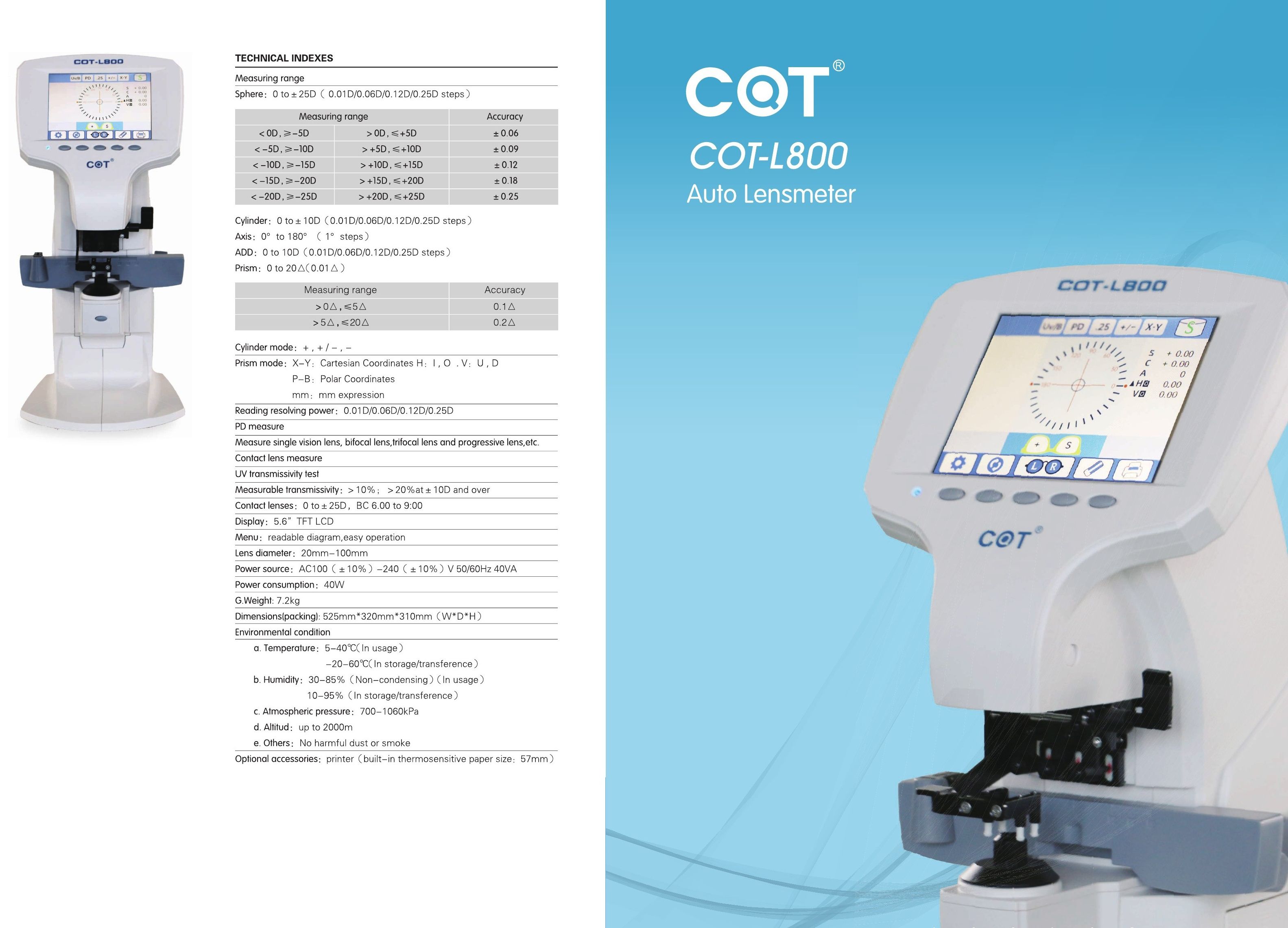 Диоптриметр (линзметр) COT-L800 + термопринтер (опционально), подходит для измерения прогрессивных и контактных линз