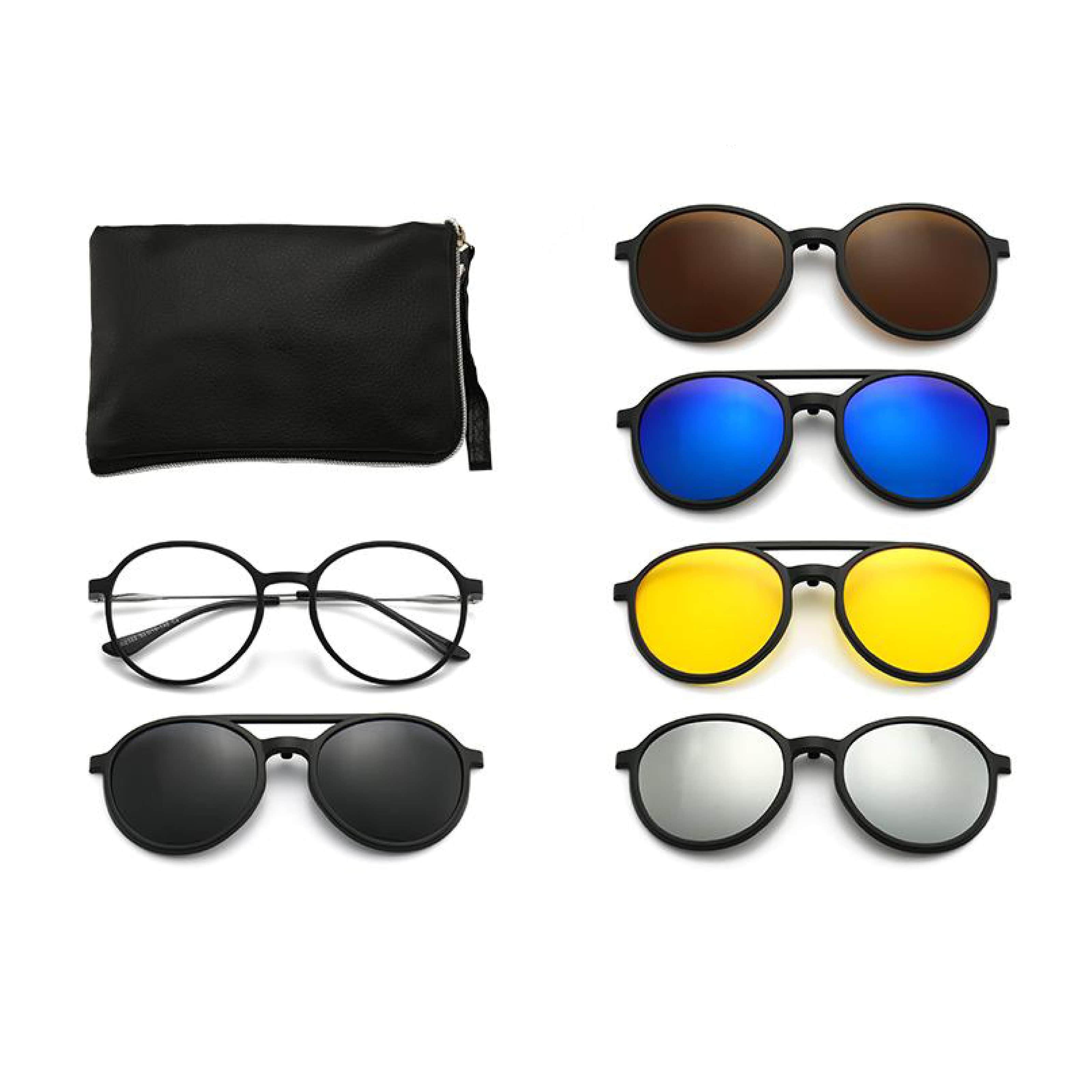 Frame with a set of polarizing protective clip-ons. These frames additionally come with a set of several magnetic attachments, which are polarized sun lenses. Eyeglass pads (or eyeglass attachments or eyeglass clip-ons) are intended for those who wear eyeglasses. In one swipe, your glasses will transform from your regular glasses to sunglasses or driving goggles. The fastening mechanism allows the pads to be folded up without removing them from the glasses. All of our covers have a polarized lens coating. Polarized coating on UV400 protection glasses absorbs up to 99% of harmful UVA and UVB rays. They are perfect not only for protecting your eyes from the sun, but also for fishing, driving, active sports.