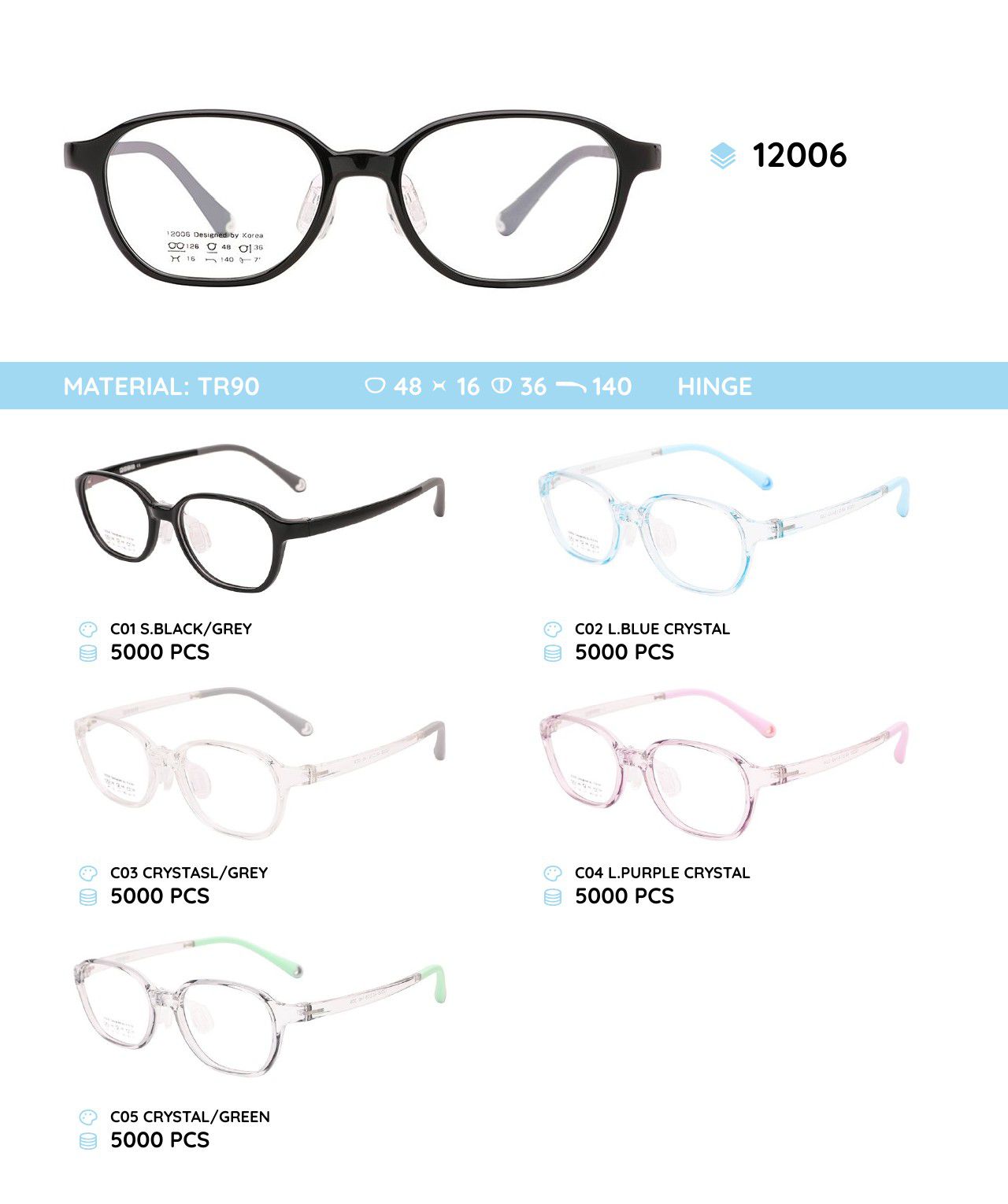 - Frame material: TR-90 plastic, silicone, metal