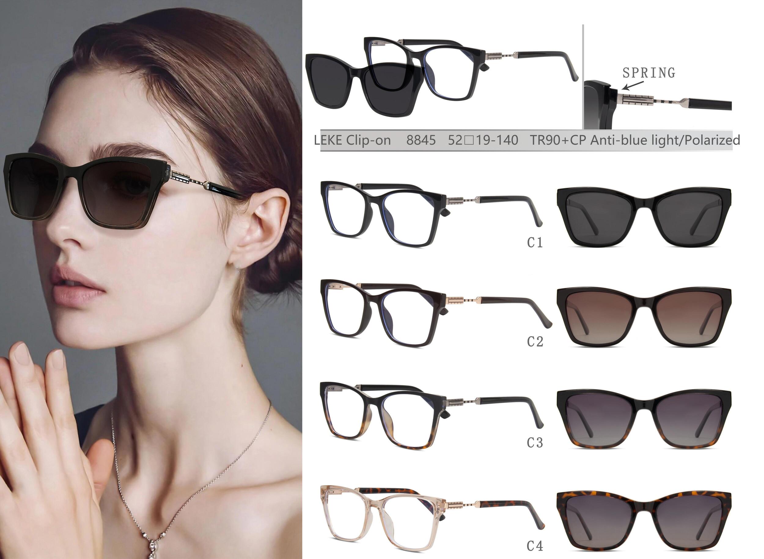 Plastic TR90+CP eyeglasses frame with blue ray cut protection, with spring hinges + sun protection polarized clip-on Leke LK8845