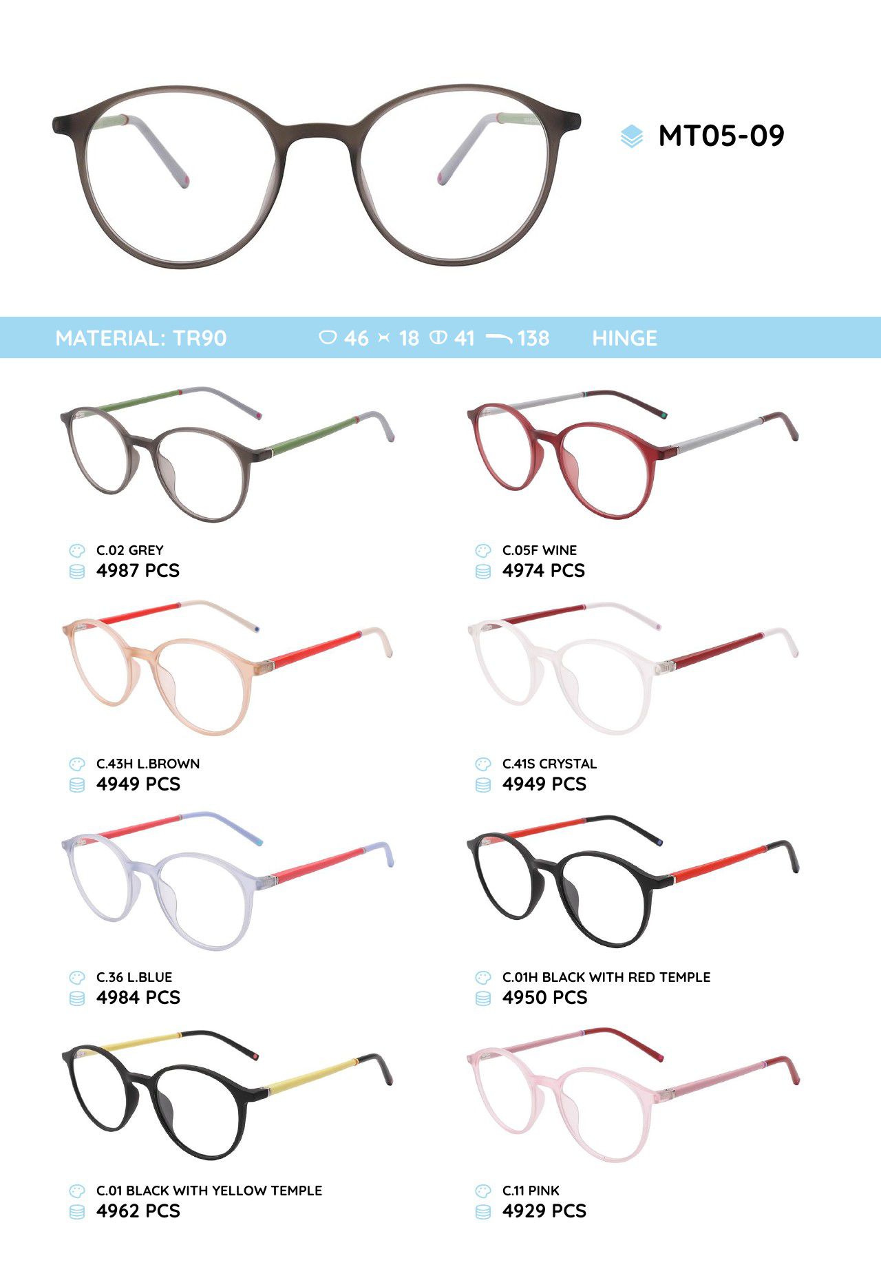 - Frame material: TR-90 plastic, silicone, metal