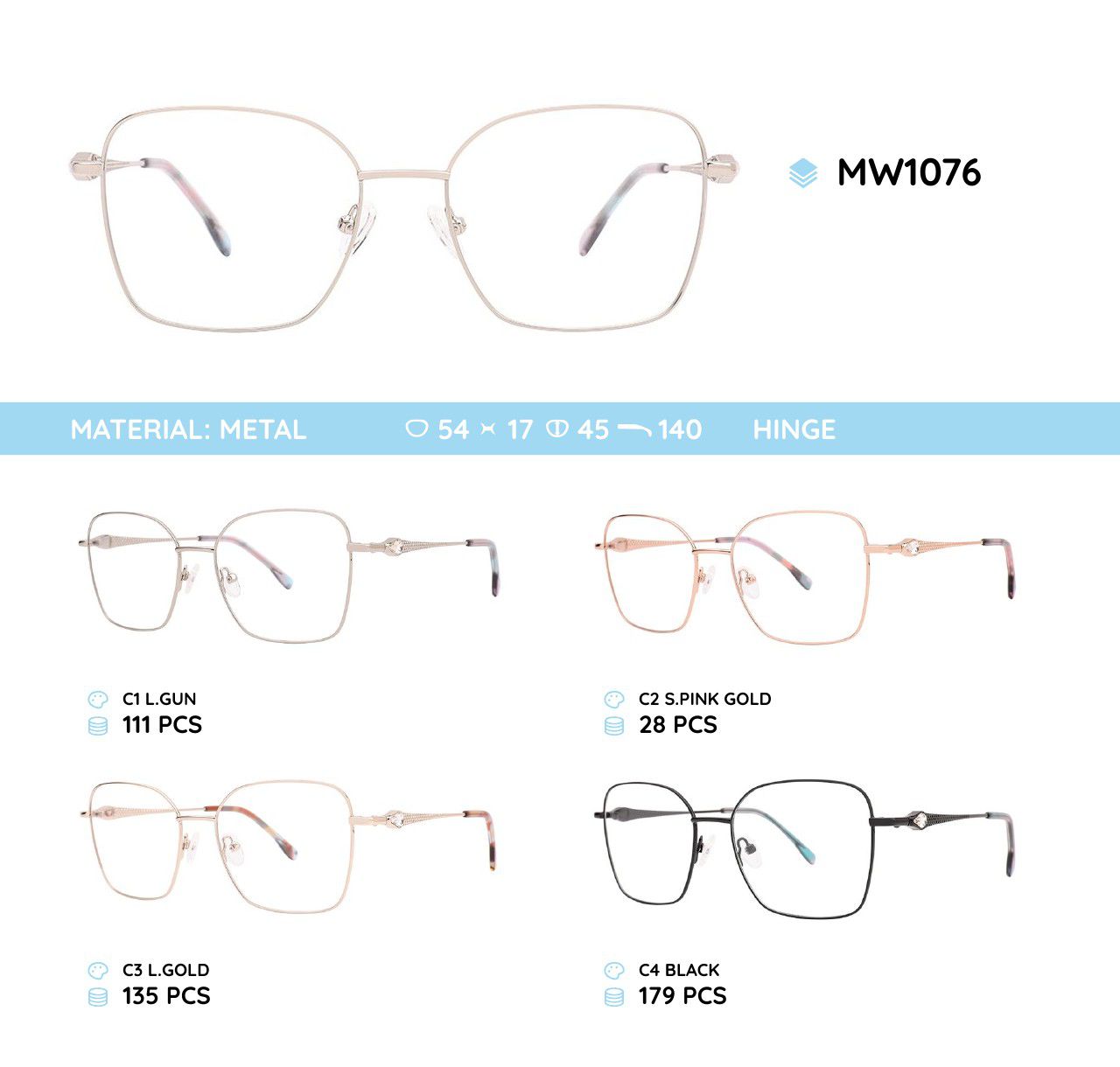 Metal frames for glasses. The material is stainless steel. The frames keep their shape well, at the same time they are flexible. High quality. Frames have good tactile properties and resistant to damage, they are lightweight and hypoallergenic. Many of models are decorated with rhinestones, have elegant temples and flex hinges. Fashionable design. This frames collection of high quality, passes piece control. In our store goods of this category have a low price for wholesale. European Conformity.