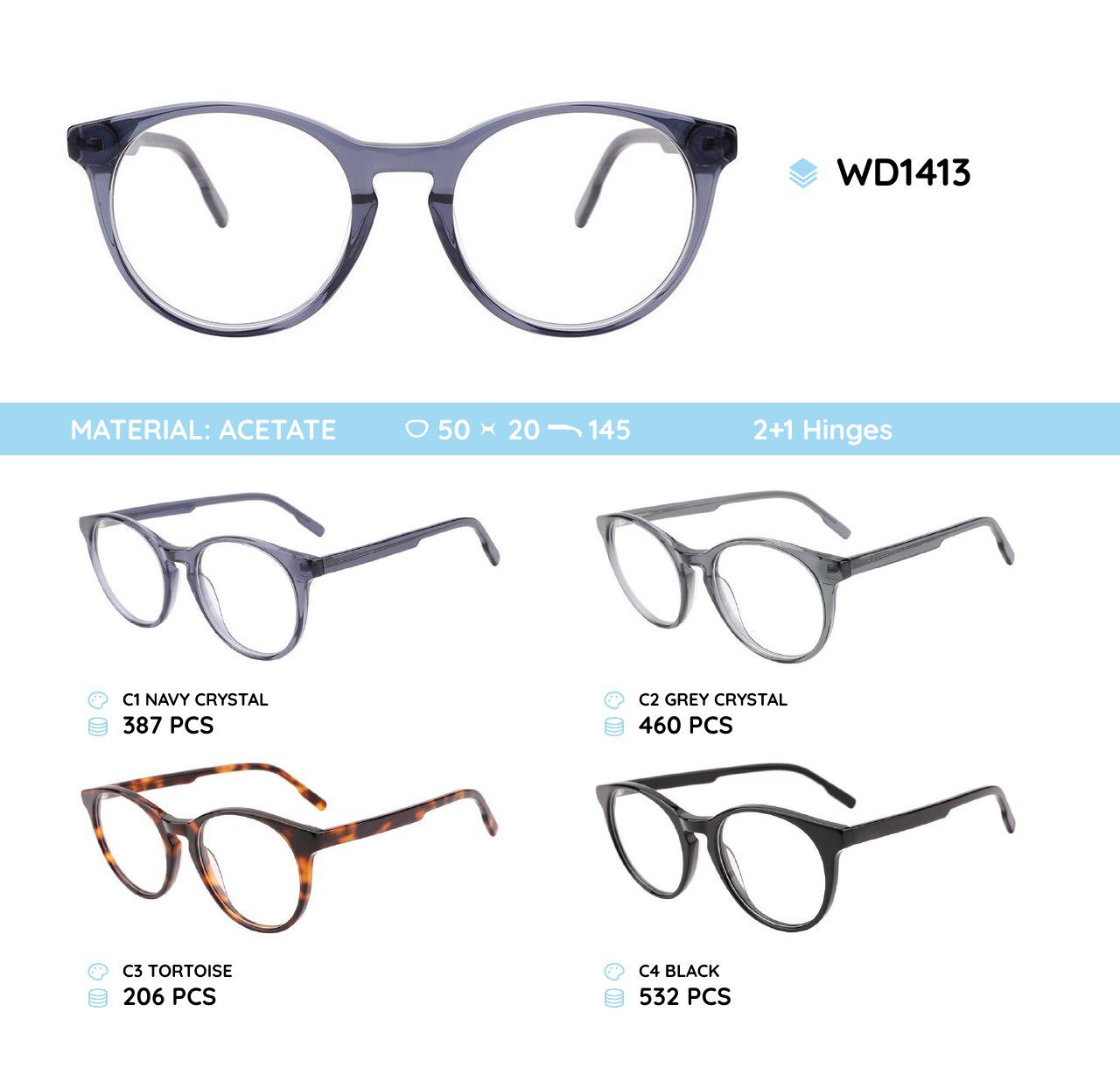 Glasses frames are plastic, acetate, milled. The frames hold their shape well, at the same time are flexible in use when making glasses, are of high quality, have pleasant tactile properties, are resistant to damage, are lightweight, and have hypoallergenic properties. Many models are decorated with rhinestones, with elegant temples and flex hinges. Fashionable design. This collection of high quality frames is individually controlled. Our store offers a low price for goods in this category for wholesale. CE standard (European Conformity).