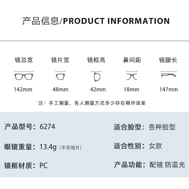 - Size: total width - 142 mm, lens width - 48 mm, lens height - 42 mm, bridge - 18 mm, temple length - 147 mm