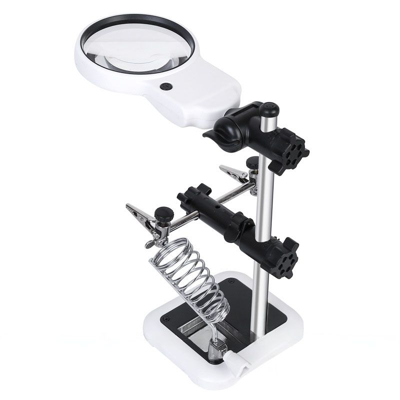 Настольная лупа представляет собой многофункциональное устройство, незаменимое для пайки, сборки мелких деталей, ювелирных работ и других задач, требующих высокой точности. Оснащенная несколькими уровнями увеличения, она позволяет детально рассматривать даже самые крошечные элементы. Главной особенностью модели являются фиксирующие держатели, которые обеспечивают устойчивую фиксацию предметов, освобождая руки для работы. В комплекте предусмотрены сменные насадки, расширяющие функциональные возможности устройства. Благодаря прочной конструкции и стабильному основанию, лупа надежна и удобна в использовании. Идеальный выбор для мастеров, радиолюбителей и ювелиров, нуждающихся в точном инструменте для детальной обработки.