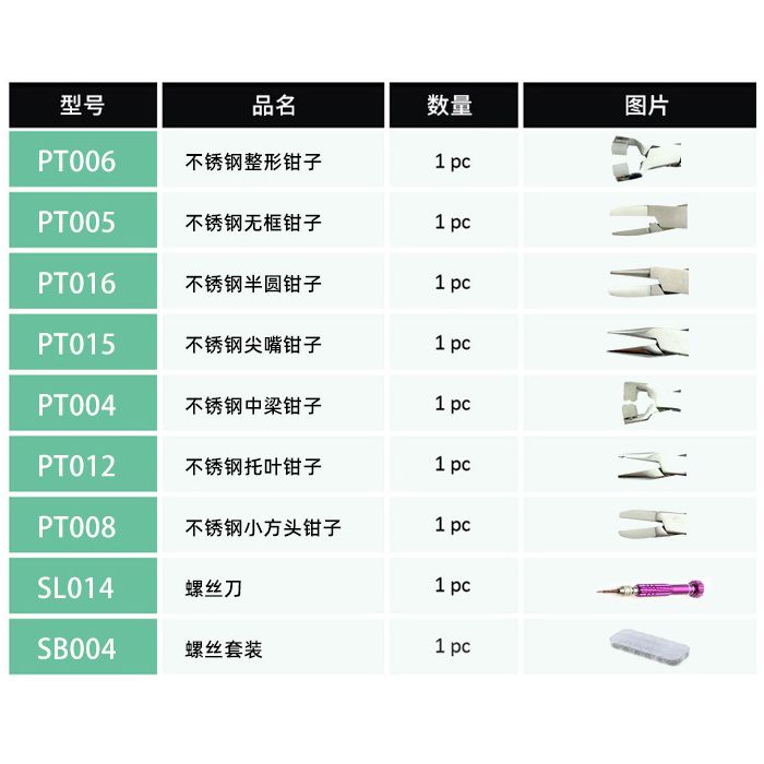 Набор инструментов для ремонта оправ R-B014, плоскогубцы, щипцы, отвёртка и другие - PT006, PT005, PT016, PT015, PT004, PT012, PT008, SL014