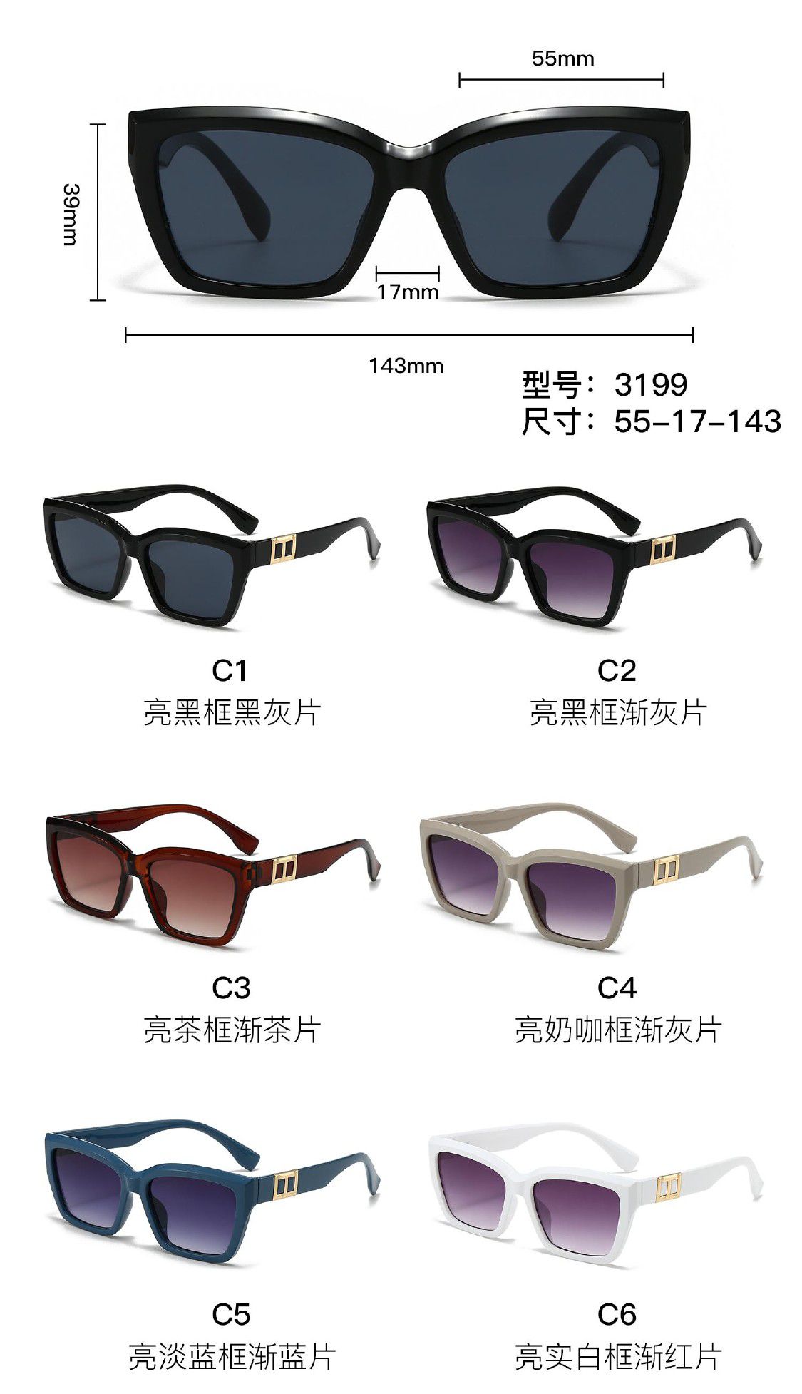 - Размер: ширина линзы - 55 мм, мост - 17 мм, длина заушника - 143 мм