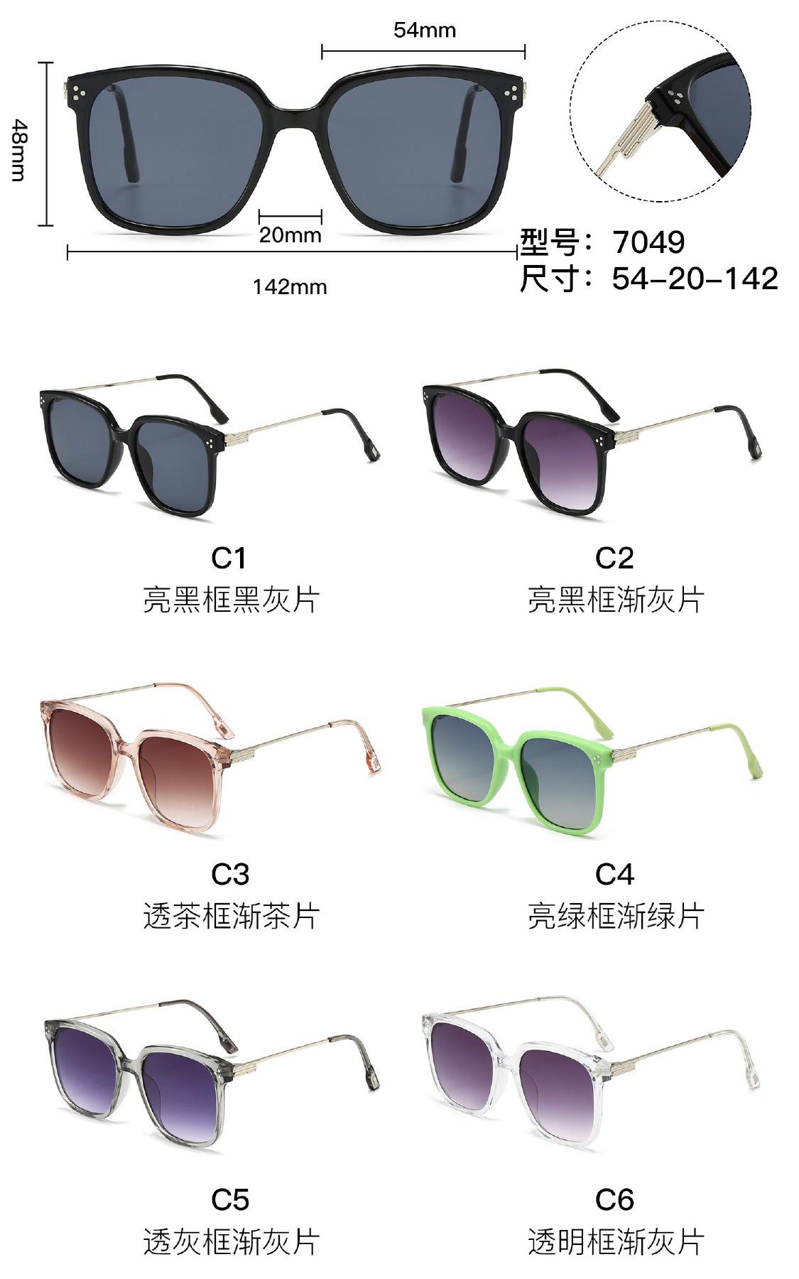 Солнцезащитные пластиковые очки из поликарбоната с металлическим шарниром 7049W
