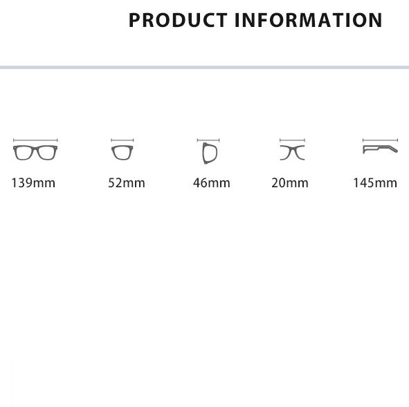 - Размер: общая ширина -139 мм, ширина линзы - 52 мм, высота линзы - 46 мм, мост - 20 мм, длина заушника - 145 мм