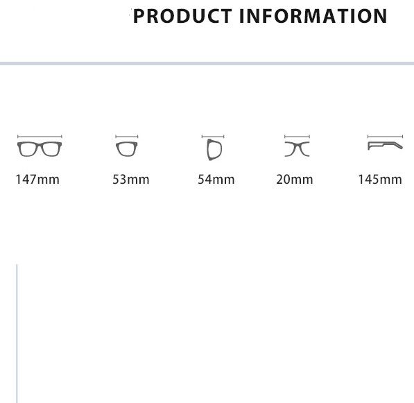 - Размер: общая ширина -147 мм, ширина линзы - 53 мм, высота линзы - 54 мм, мост - 20 мм, длина заушника - 145 мм