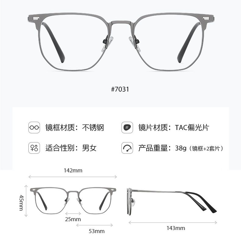 Оправа металлическая с защитой от синего света + 2 магнитные солнцезащитные насадки (клипон) 7031-GT