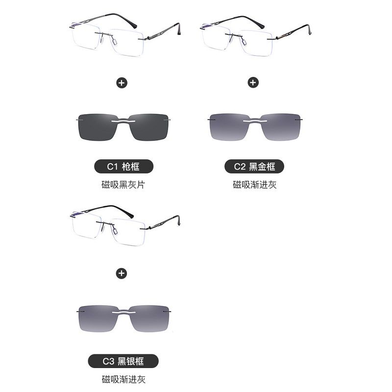 Оправа безрамочная металлическая мужская + магнитная солнцезащитная насадка (клипон) 7202-GT