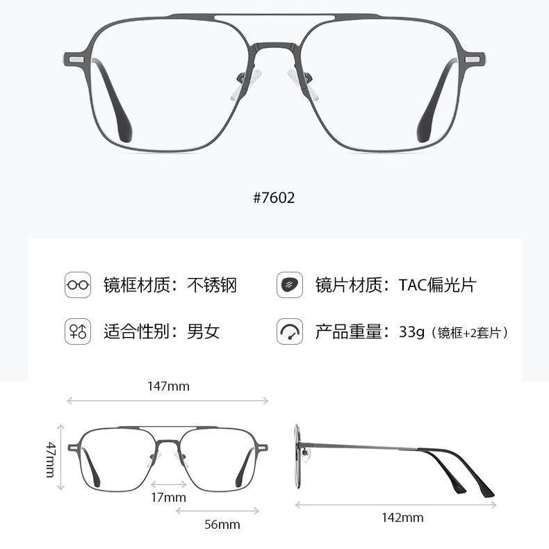 Оправа металлическая с защитой от синего света + 2 магнитные солнцезащитные насадки (клипон) 7602-GT