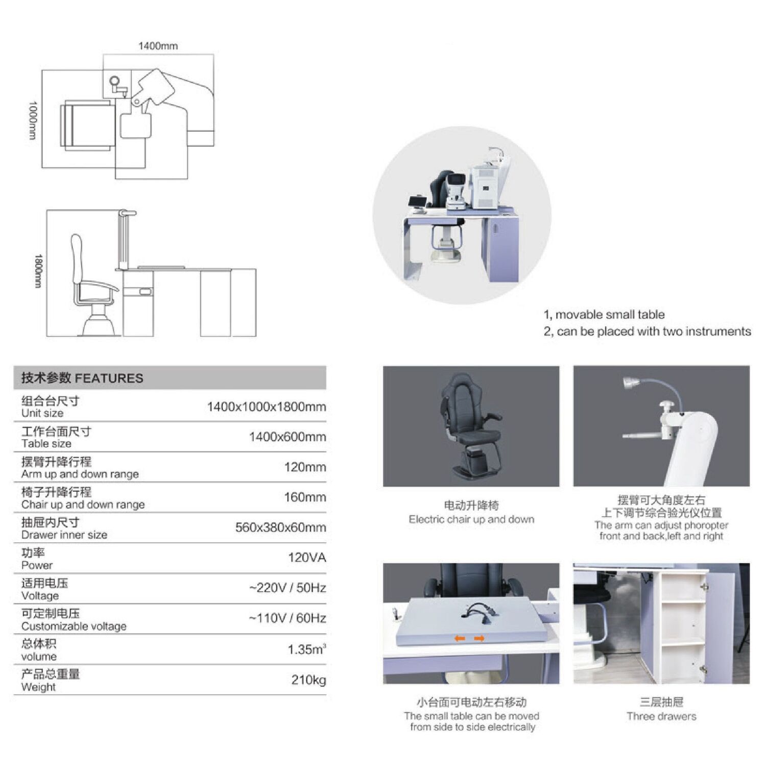 Модель включает в себя всё необходимое для проведения офтальмологических обследований. Удобная столешница с выдвижным ящиком и электроподъёмным механизмом регулировки по высоте. В верхней части рабочего места офтальмолога располагается лампа, угол наклона которой можно изменять. Для закрепления фороптера предусмотрены встроенные кронштейны. Без кронштейна для проектора. В комплект входит кресло.