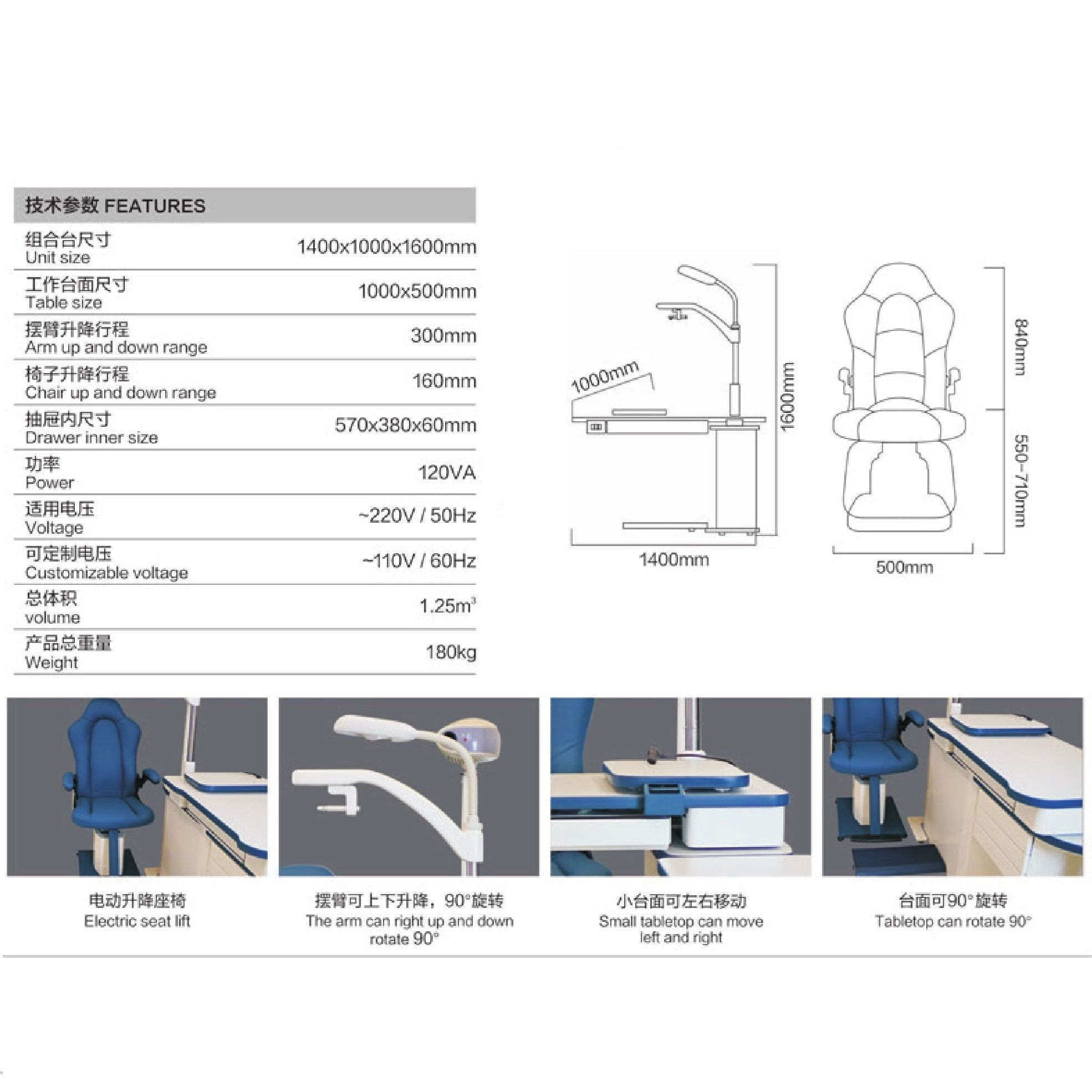 Модель включает в себя всё необходимое для проведения офтальмологических обследований. Удобная столешница с выдвижным ящиком и электроподъёмным механизмом регулировки по высоте. В верхней части рабочего места офтальмолога располагается лампа, угол наклона которой можно изменять. Для закрепления фороптера и проектора предусмотрены встроенные кронштейны. В комплект входит кресло.