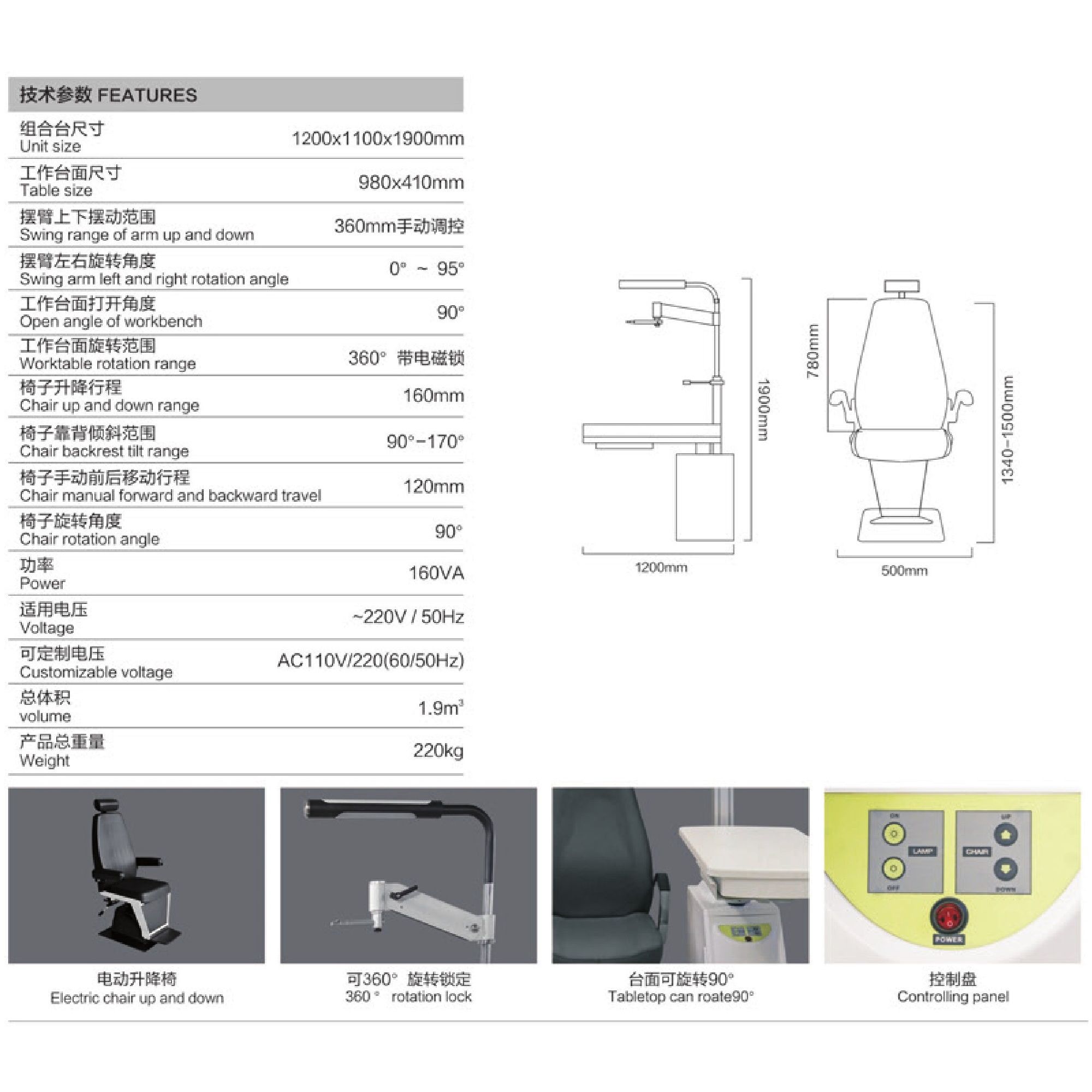 Рабочее место офтальмолога, комбинированный стол с сенсорным управлением + кресло S-900AL, столешница 980*410 мм