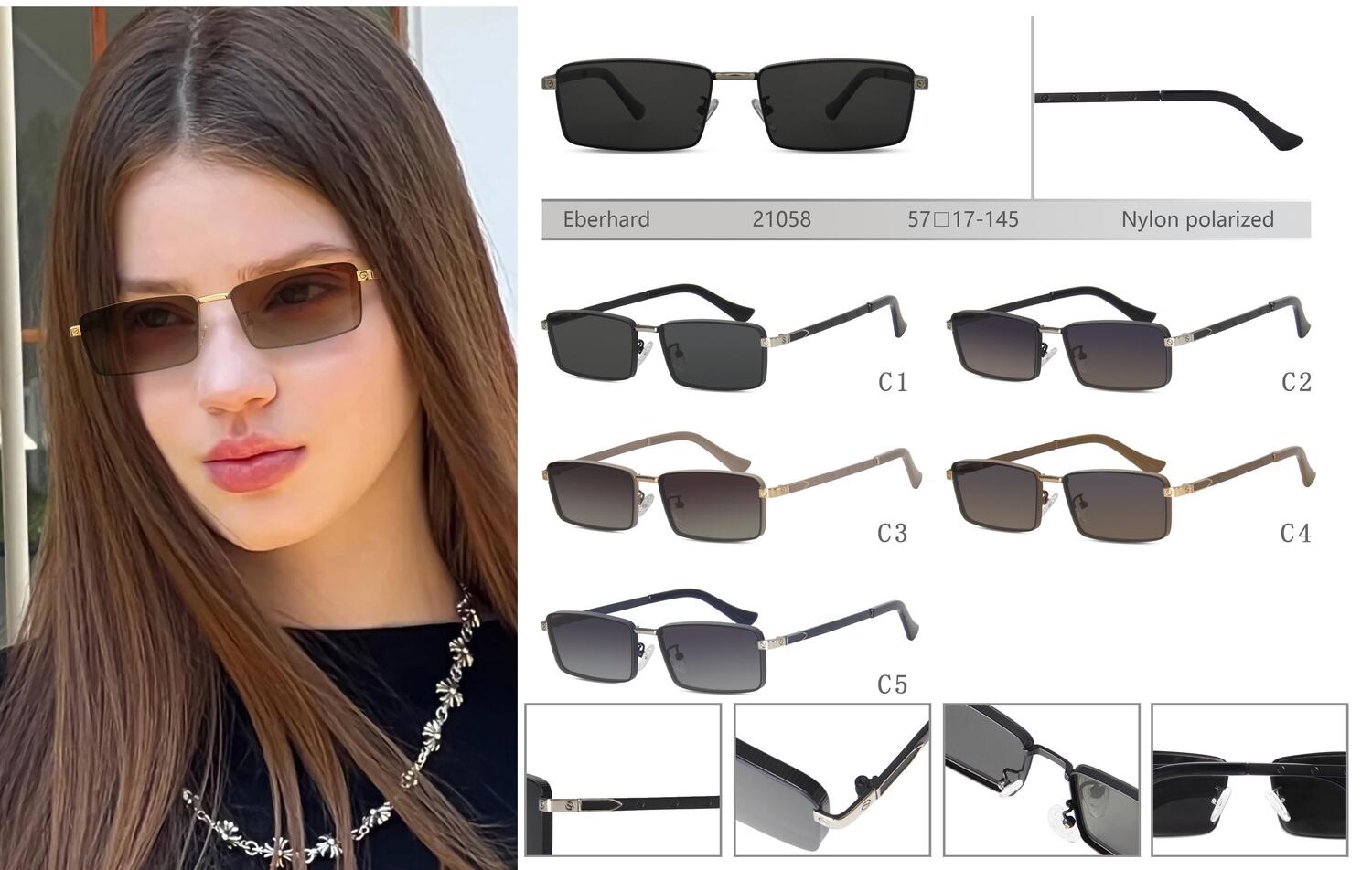 Eberhard polarized sunglasses with a metal frame and nylon lenses are a stylish and functional accessory that provides reliable protection from UV rays and glare. Polarized lenses effectively reduce reflections from water, snow, and road surfaces, enhancing clarity and contrast. The lightweight and durable metal frame ensures durability and comfort in everyday use, while the nylon lenses are highly resistant to impacts and scratches. These sunglasses are ideal for outdoor activities, driving, and everyday wear, combining modern design with practicality.