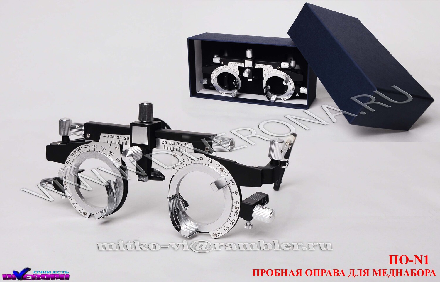 The frame is designed to install astigmatic and stigmatic trial spectacle lenses, prisms, prism compensators, as well as filters, diaphragms and other optical elements. To determine the direction of astigmatism and strabismus, the rim is equipped with an angular scale. Rotation of lenses, prisms and other optical elements relative to the scale is made using a lens holder. The change in the center-to-center distance is made separately, while the value is read from the center of the nasal seal in the range from 48 to 80 mm. To improve the accuracy of the selection of glasses and patient comfort frame allows you to change the length of the ear hooks, their inclination, as well as the inclination and position of the height of the nose pad.