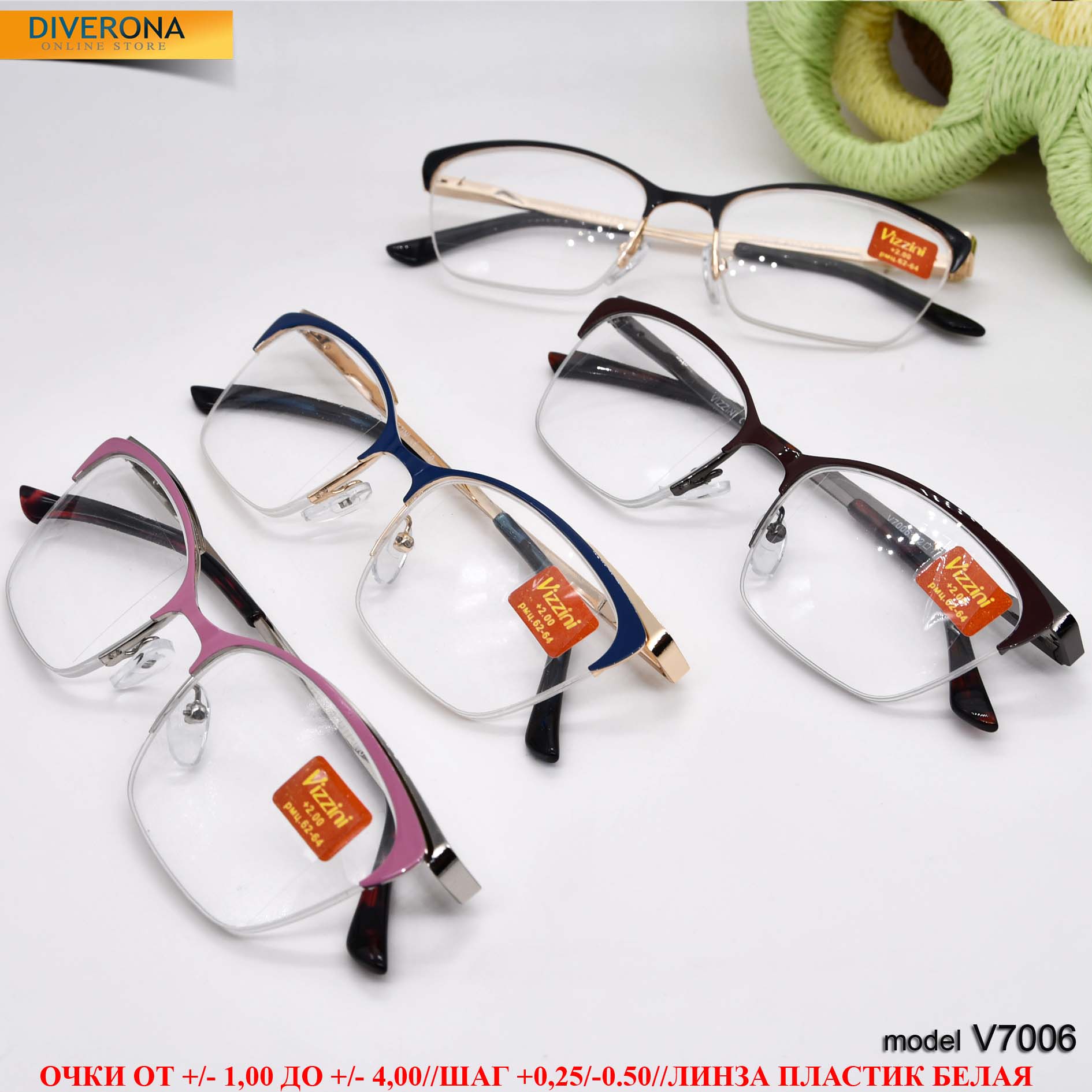 Women's metal eyeglasses with flex hinges Vizzini V7006, dioptries +1,00 to +4.00 (step 0.25); -1.00 to -4,00; 6,50 to -8.00 (step 0.5)