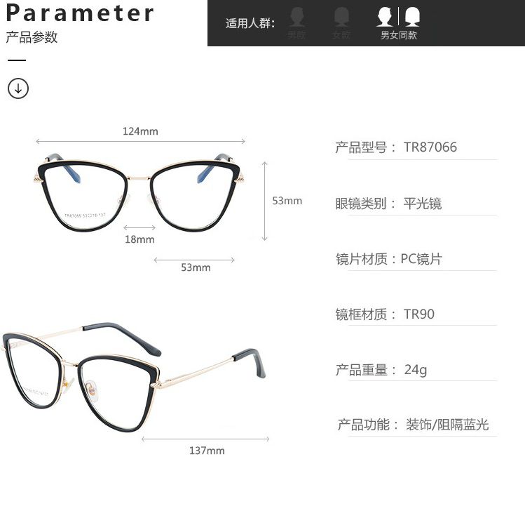 Combined frame (metal + TR90) or glasses with blue light protection, with spring hinges FA87066