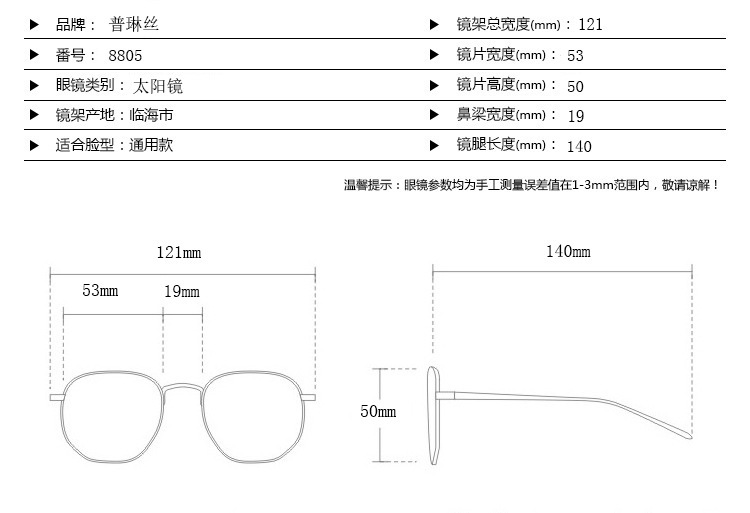 - Size: lens width - 53 mm, bridge - 19 mm, temple - 140 mm, total width - 121 mm, lens height - 50 mm