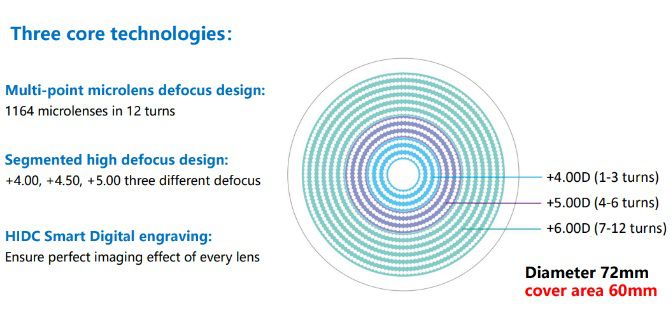 The lens is designed to introduce a mechanism of action (a signal) at the retina of the eye to help slow the progression of myopia. The lens has ring shaped elements that alternate with zones that correct for distance refractive error of the eye. In combination, they deliver simultaneous myopic defocus, or in other words, the eye receives simultaneous competing blur and clear images, at the retina of the eye. A central clear area that does not contain the ring like elements corrects the distance refractive error.