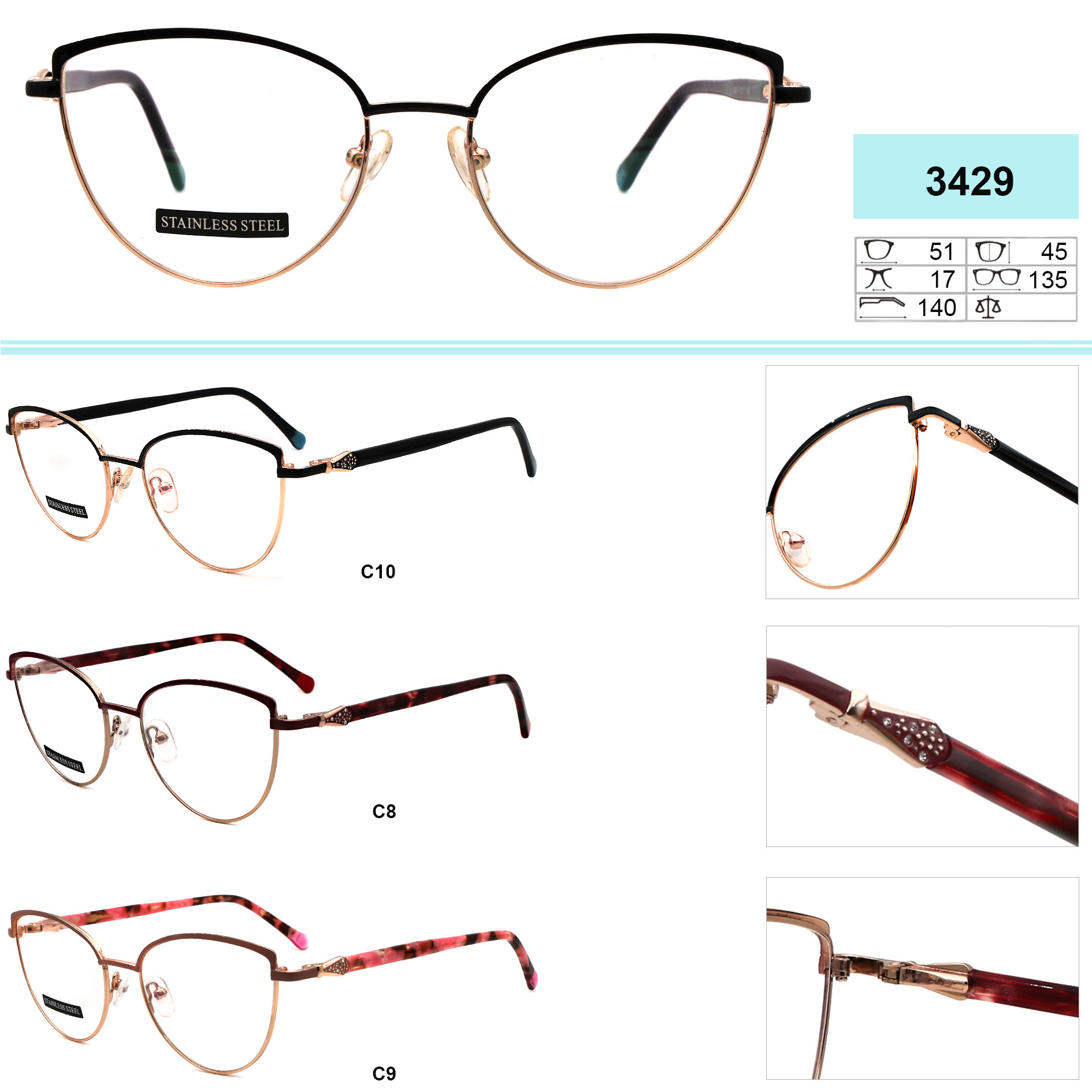 Metal frames for glasses. The material is stainless steel. The frames keep their shape well, at the same time they are flexible. High quality. Frames have good tactile properties and resistant to damage, they are lightweight and hypoallergenic. Many of models are decorated with rhinestones, have elegant temples and flex hinges. Fashionable design. This frames collection of high quality, passes piece control. In our store goods of this category have a low price for wholesale. European Conformity.