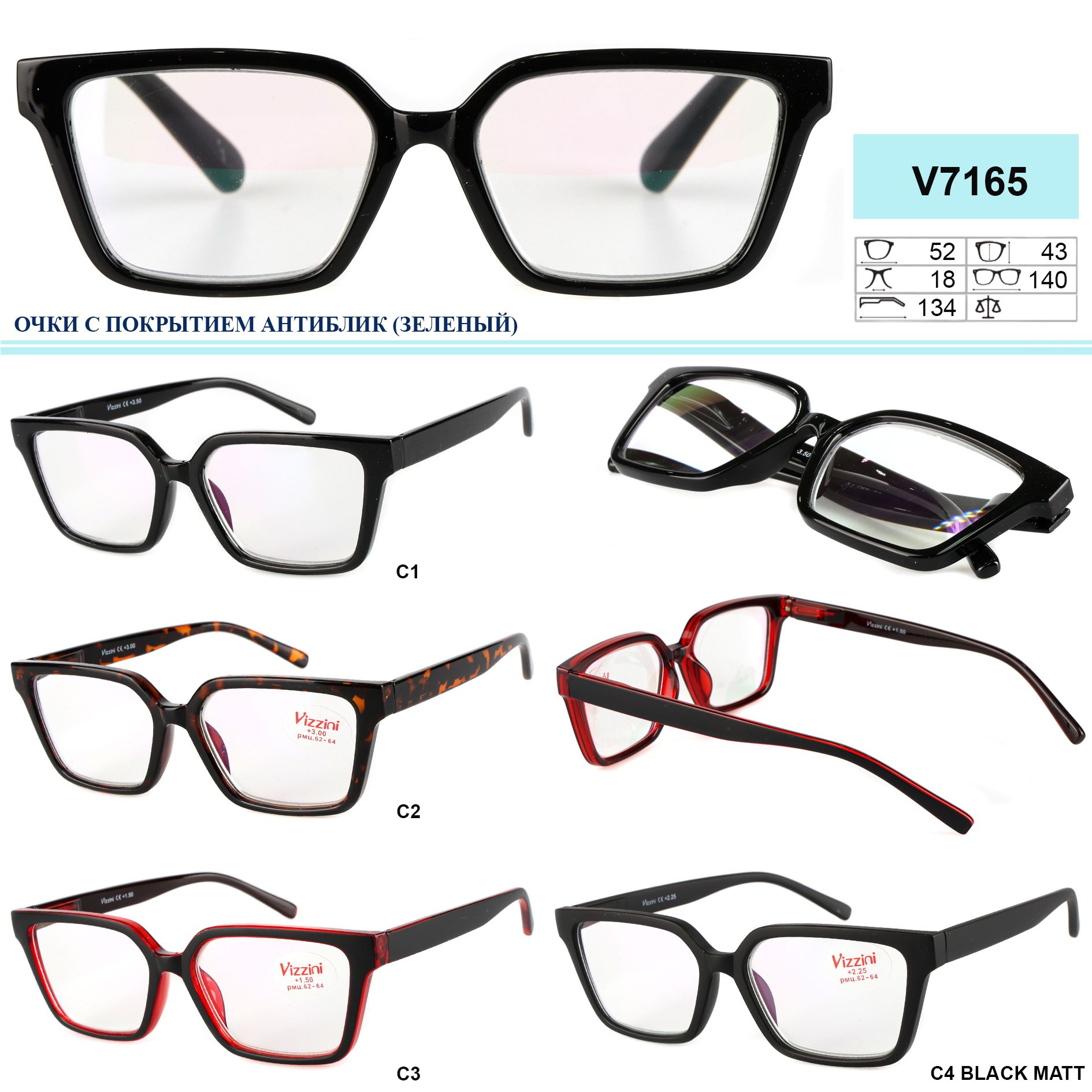 Очки женские антиблик в пластиковой оправе Vizzini V7165, диоптрии от +1.00 до +3.00 (шаг 0,25) до+6,0(0,50)