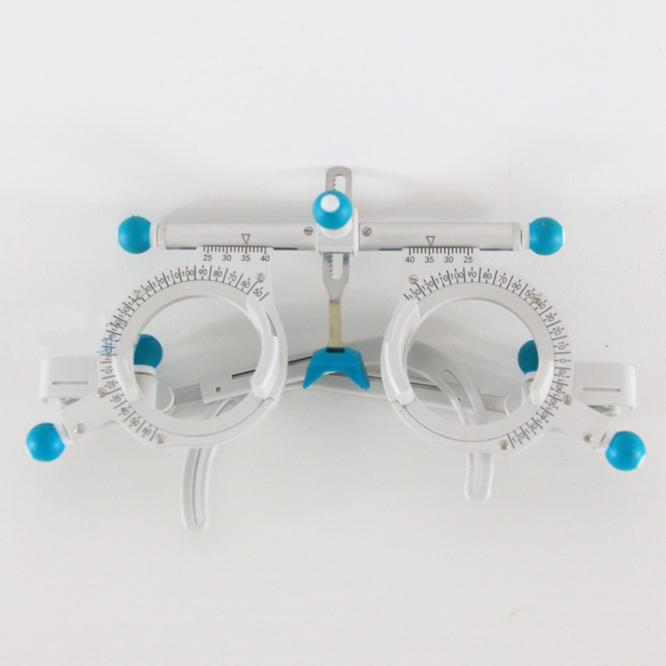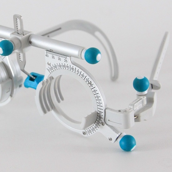 Пробная оправа аналог немецкой модели представляет собой медицинское приспособление для качественного и удобного подбора очковых линз для людей с проблемами зрения. Ось цилиндрических и призматических линз может меняться поворотом шарнирных винтов, и положение оси можно определять по круговой шкале на обеих сторонах рамы, причем круговая шкала имеет 0° слева по горизонтальной линии, 180° — справа и 90° — по вертикальной линии.