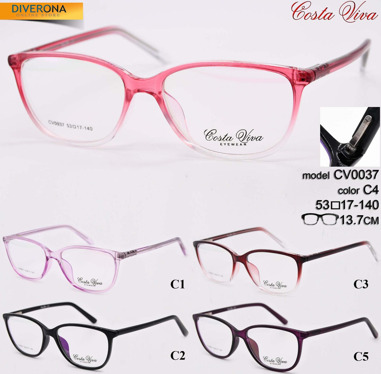Пластиковые оправы для очков Costa Viva. Оправы хорошо держат свою форму, в тоже время эластичны в работе при изготовлении очков, высокого качества, имеет приятные тактильные свойства, устойчивы к повреждениям, легки, обладают гипоаллергенными свойствами. Многие модели декорированы стразами, с элегантными заушниками и флексами. Модный дизайн. Данная коллекция оправ высокого качества, проходит штучный контроль. В нашем магазине дана низкая цена на товар данной категории, для оптовой продажи. Стандарт CE (европейский стандарт качества).