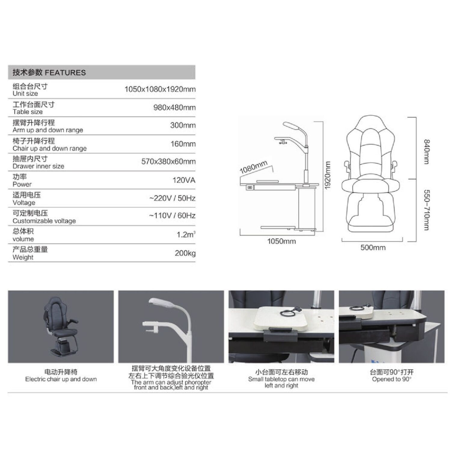 Модель включает в себя всё необходимое для проведения офтальмологических обследований. Удобная столешница с выдвижным ящиком и электроподъёмным механизмом регулировки по высоте. В верхней части рабочего места офтальмолога располагается лампа, угол наклона которой можно изменять. Для закрепления фороптера и проектора предусмотрены встроенные кронштейны. В комплект входит кресло.