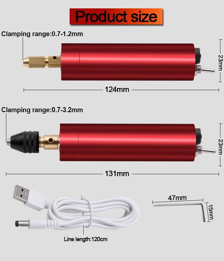 - Диапазон зажима для сверла: 0.7 ~ 1.2 мм (с золотым патроном) / 0.7 ~ 3.2 (с чёрным патроном)