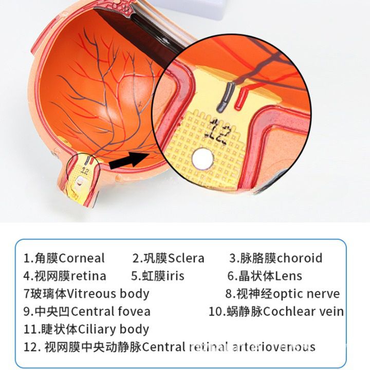 Модель подходит для использования в средних школах в качестве наглядного пособия при объяснении курсов физиологии и гигиены. Модель используется для демонстрации анатомии человеческого глазного яблока, например, трех оболочек (адвентиции, медии и интимы) стенки глазного яблока и основных преломляющих тел, хрусталика и стекловидного тела, которые заполняют внутреннюю часть.