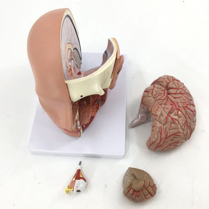 Эта модель представляет собой анатомическую модель головы из 4 частей нормального размера. Среди них мозг, мозжечок и глазные яблоки. Части можно вынуть, чтобы рассмотреть детали. Одновременно воспроизведено внутреннее строение полости рта и полости носа. Макет изготовлен из высококачественного пластика и закреплен на подставке.