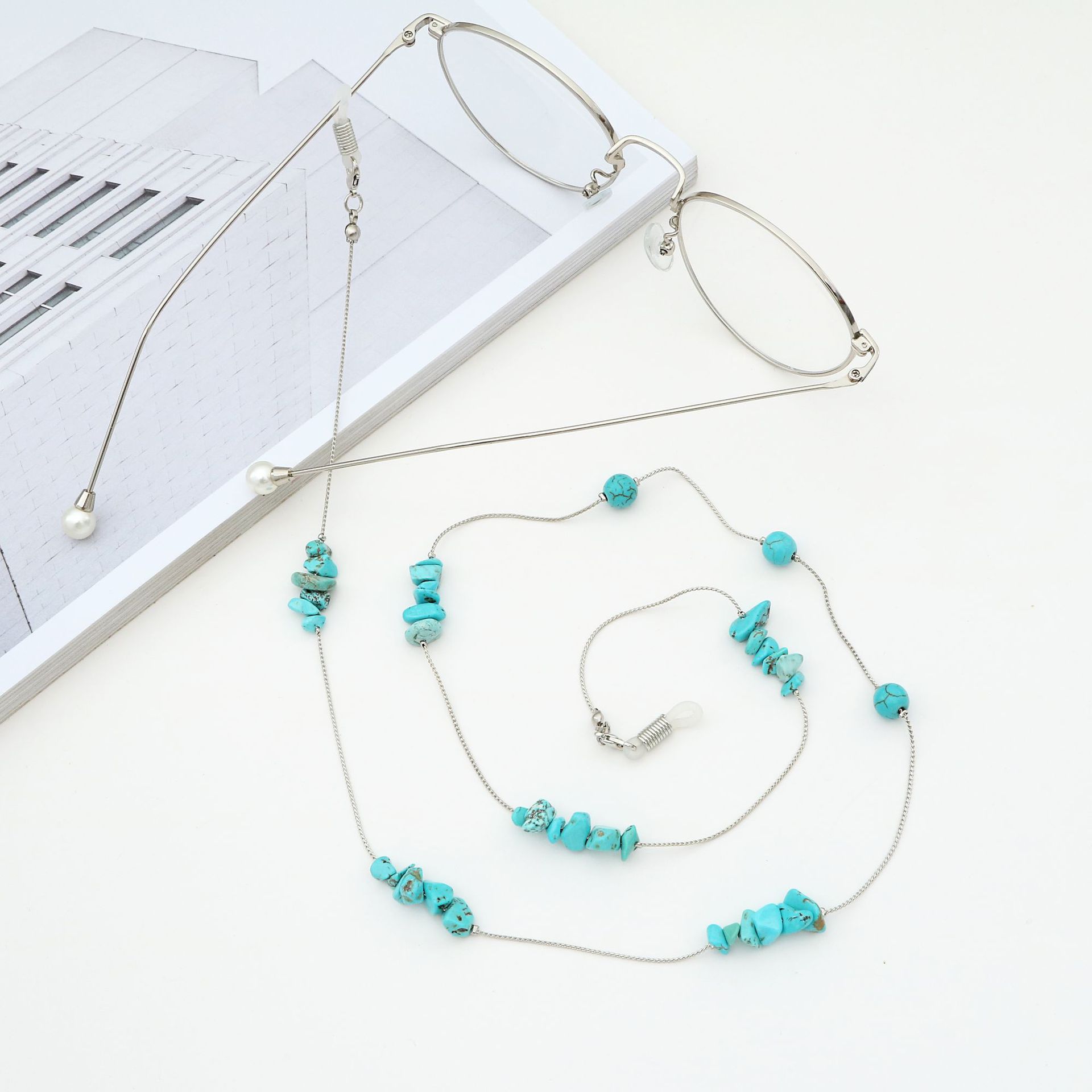 Металлическая нескользящая цепочка серебряного цвета, с натуральной бирюзой, для очков и масок GA056