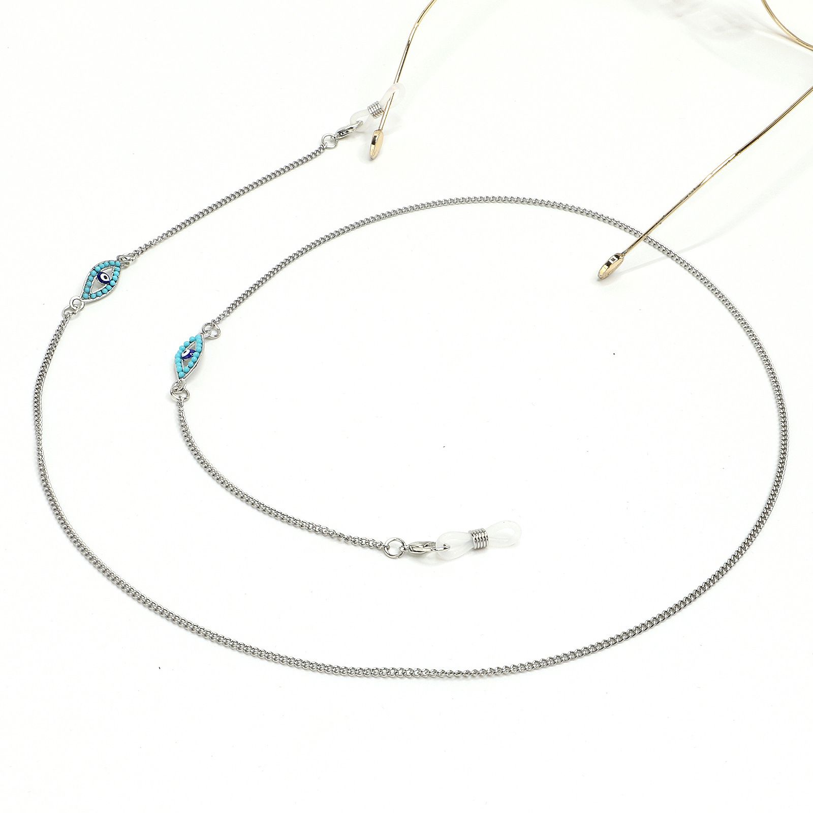 Металлическая нескользящая цепочка стального цвета, с бирюзовыми глазками, для очков и масок GS042