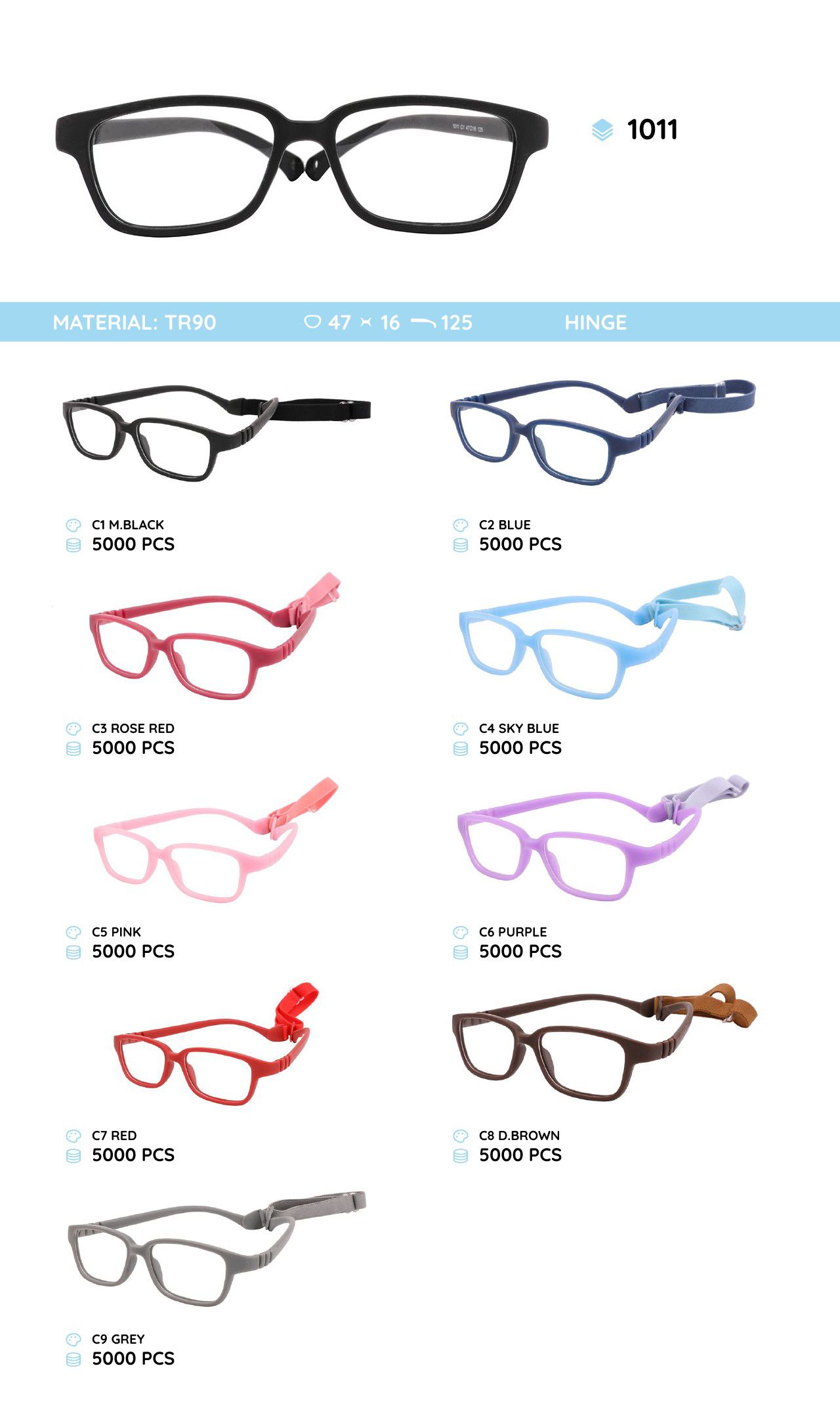 - Frame material: TR-90 plastic, silicone, metal