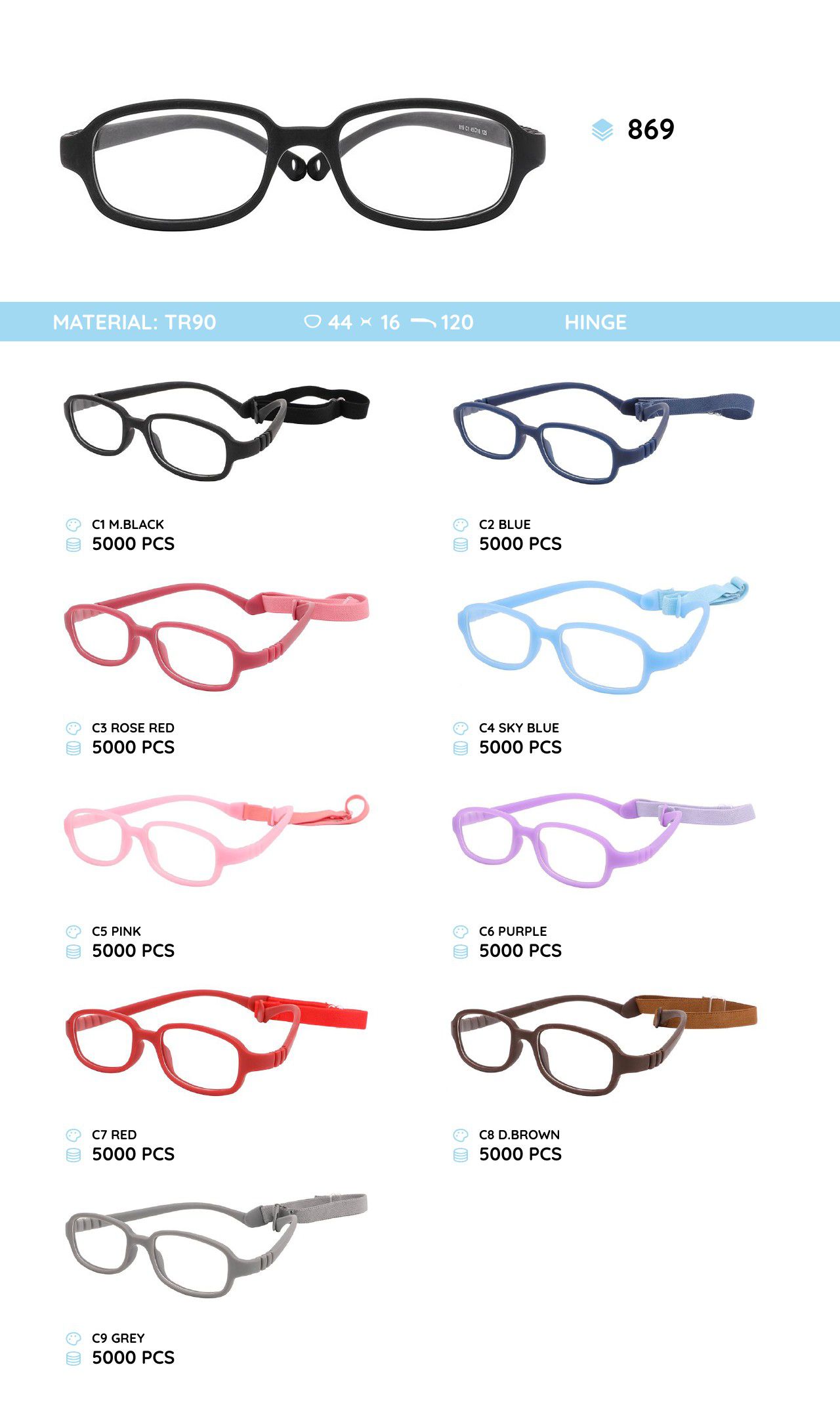 - Frame material: TR-90 plastic, silicone, metal