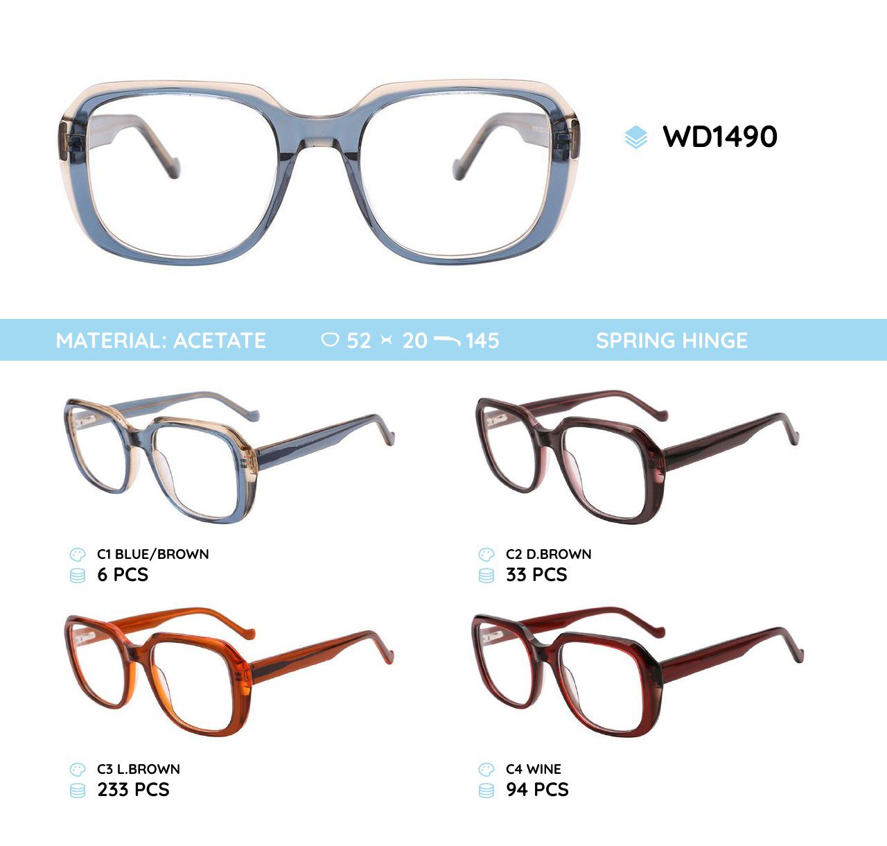 Glasses frames are plastic, acetate, milled. The frames hold their shape well, at the same time are flexible in use when making glasses, are of high quality, have pleasant tactile properties, are resistant to damage, are lightweight, and have hypoallergenic properties. Many models are decorated with rhinestones, with elegant temples and flex hinges. Fashionable design. This collection of high quality frames is individually controlled. Our store offers a low price for goods in this category for wholesale. CE standard (European Conformity).