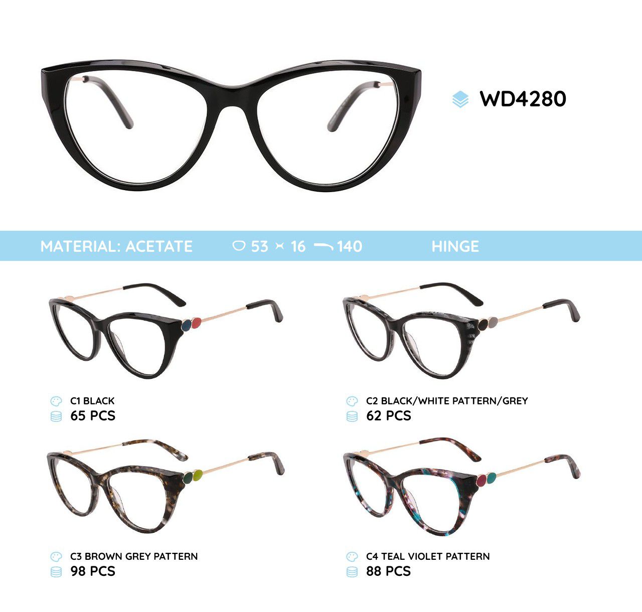 Glasses frames are plastic, acetate, milled. The frames hold their shape well, at the same time are flexible in use when making glasses, are of high quality, have pleasant tactile properties, are resistant to damage, are lightweight, and have hypoallergenic properties. Many models are decorated with rhinestones, with elegant temples and flex hinges. Fashionable design. This collection of high quality frames is individually controlled. Our store offers a low price for goods in this category for wholesale. CE standard (European Conformity).