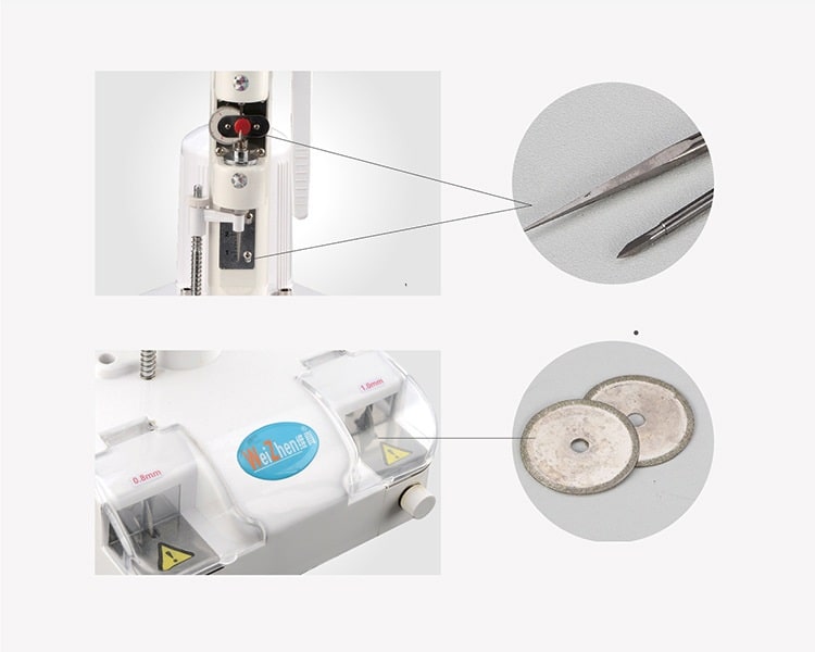 - Application: manual punching and trimming of various types of spectacle lenses for rimless frames