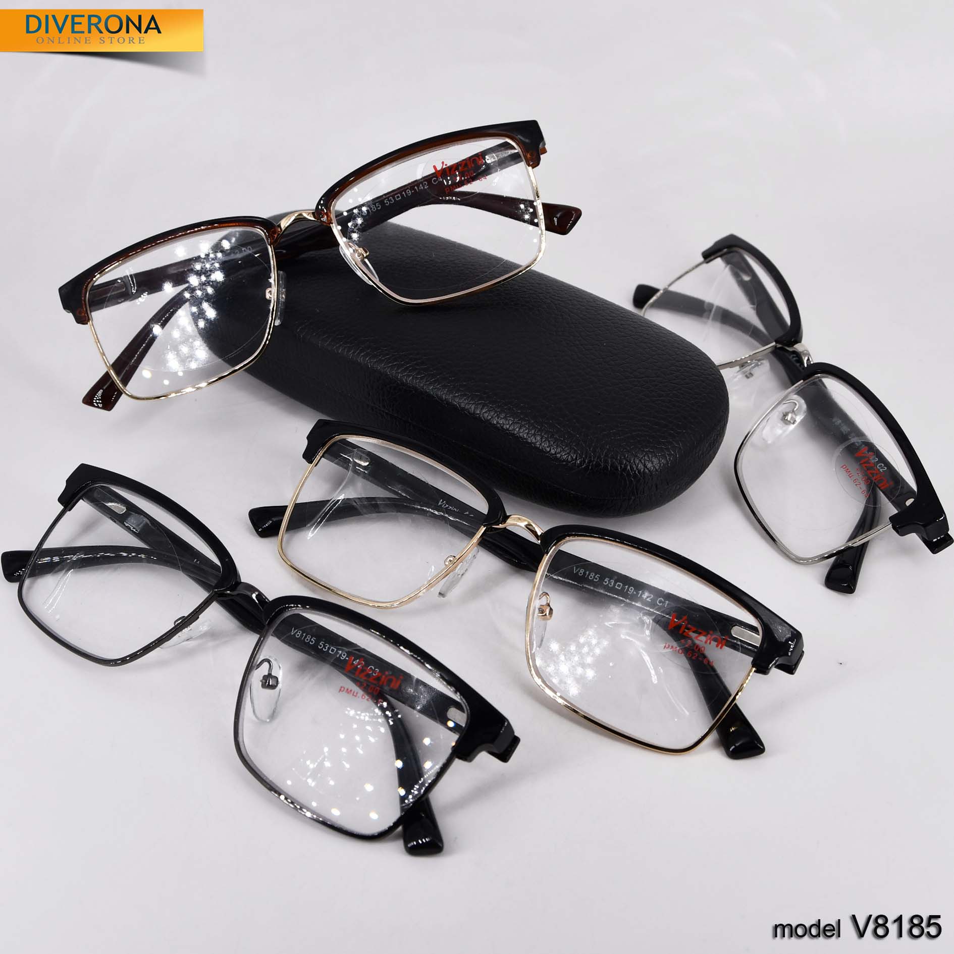 Metal frame eyeglasses with plastic lenses. Elegant temples with flex hinges. Glasses are centered RMC=62-64mm. 4 frame colors in the box. Box set = 16 pieces