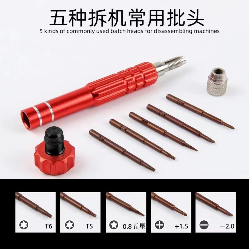 - Комплект: держатель + 5 насадок (крестовые 1.8, 1.5, 1.2, шлицевые 2.0, 1.0)