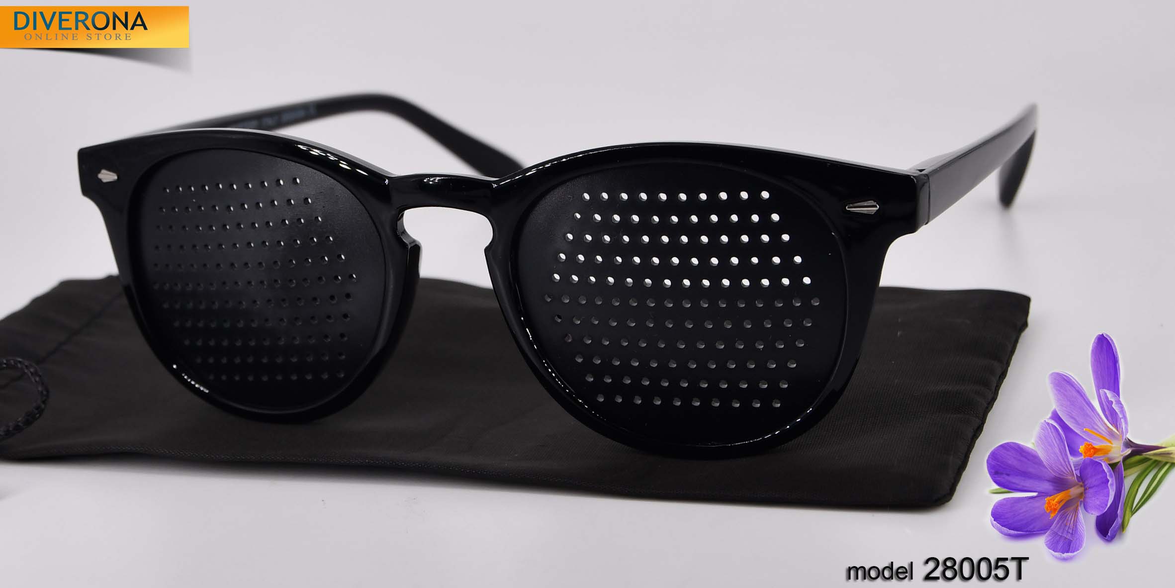 Перфорационные очки (они же очки-тренажеры, перфорированные, дырочные очки) представляют собой металлическую или пластиковую оправу, в которую вместо обычных очковых линз вставлены пластины из непрозрачного черного пластика с множеством круглых отверстий.