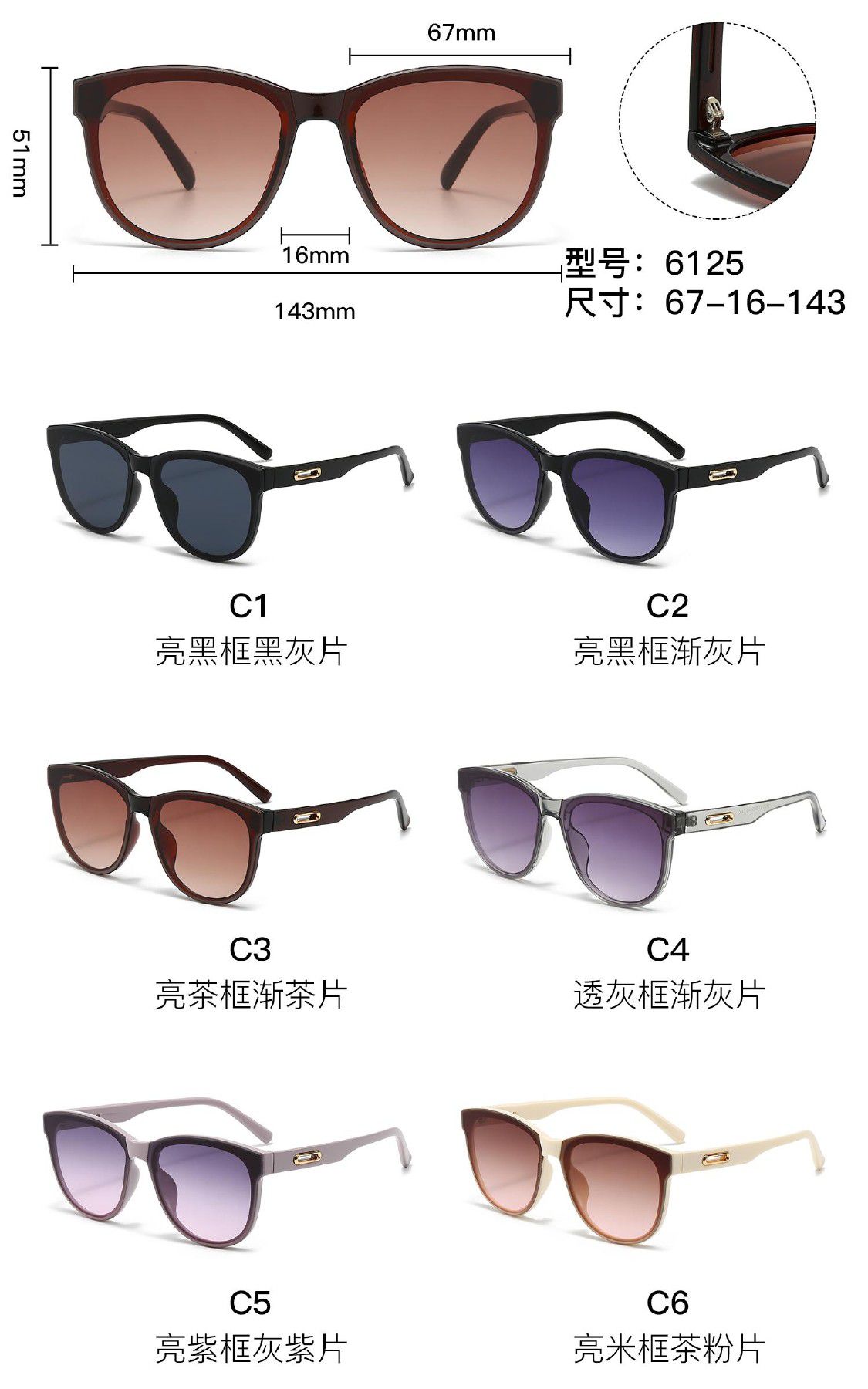 Солнцезащитные пластиковые очки из поликарбоната с металлическим шарниром 6125W