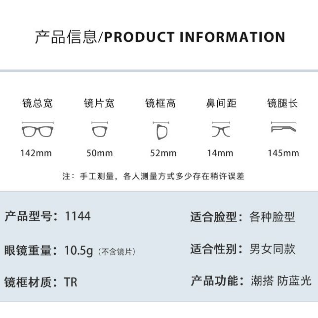 - Размер: общая ширина -142 мм, ширина линзы - 50 мм, высота линзы - 52 мм, мост - 14 мм, длина заушника - 145 мм