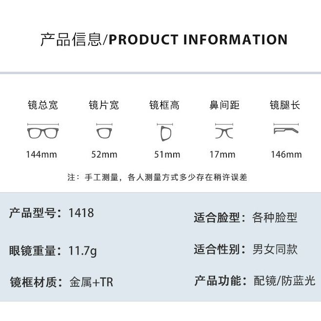 - Размер: общая ширина -144 мм, ширина линзы - 52 мм, высота линзы - 51 мм, мост - 17 мм, длина заушника - 146 мм