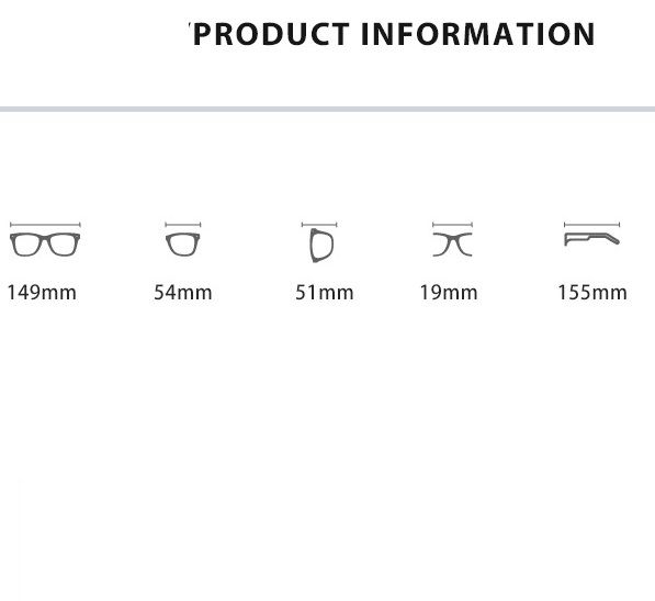 - Размер: общая ширина -149 мм, ширина линзы - 54 мм, высота линзы - 51 мм, мост - 19 мм, длина заушника - 155 мм
